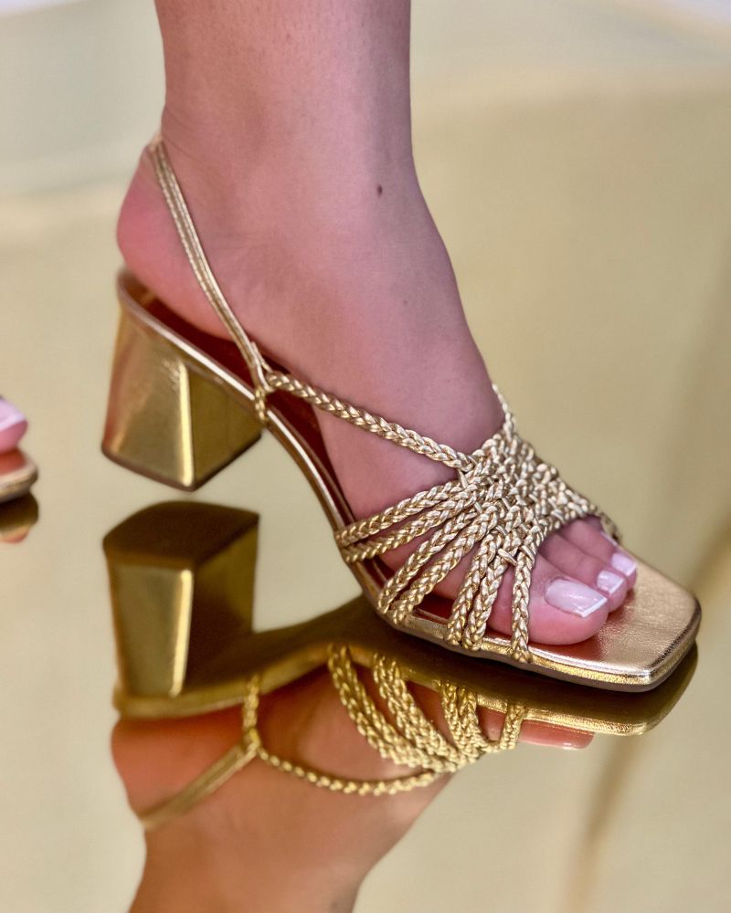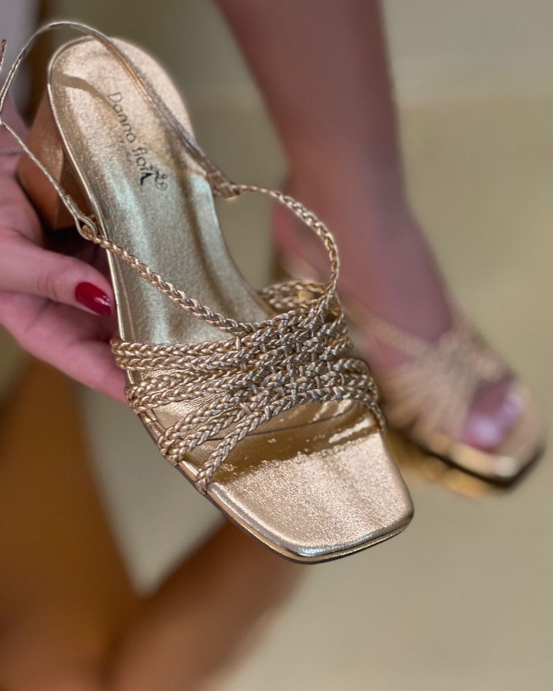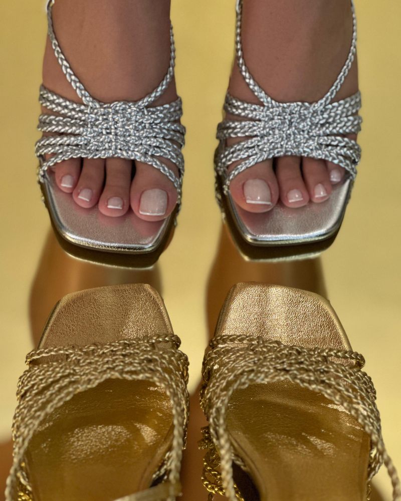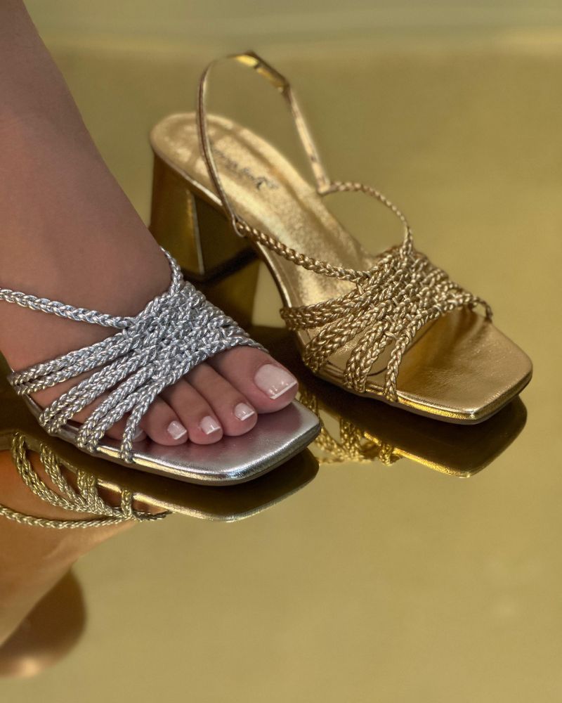 A Sandália Lorraine de salto bloco combina charme e modernidade em um design encantador. Disponíveis nas versões dourada e prata, elas destacam-se pelas tiras finas trançadas que abraçam delicadamente o pé, criando um visual sofisticado e repleto de estilo.